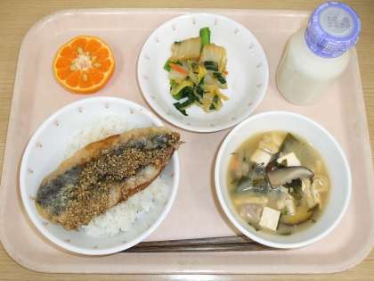 今日のかば焼きは“イワシの開き”で作りました。イワシは身がやわらかく、調理に気を使う魚です。今日は、調理員さんがやさしく取り扱っていたので、きれいなかば焼きに仕上がっていました。甘辛いタレもおいしかったですね。