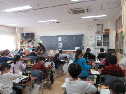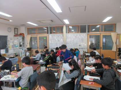 6日(木)の3・4時間目、3年4組は習字の時間でした。今回は、「小川」と書きました。はねやはらいに気を付けながら、練習をしていました。