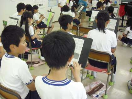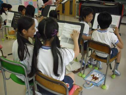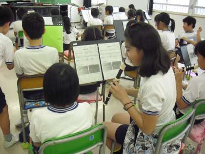 5年生の音楽の授業の様子です。「一輪の赤い花」という曲のリコーダーでの演奏を練習しているところです。友達の演奏を聴き合いながら譜面を目で追っていき、気付いたことを伝え合っています。