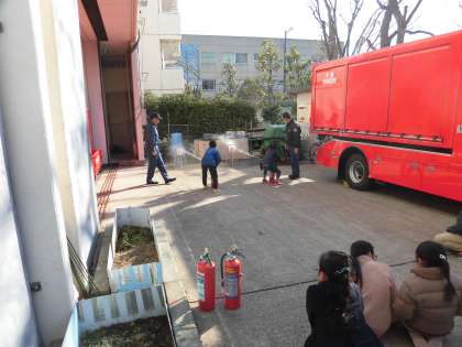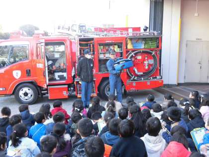 消防署では、隊員の皆さんが、出動の様子や消防服への早着替えなどを見せてくださいました。また、消火の際に使う道具なども見せていただき、消防車の中にコンパクトに収納できる工夫があることも知りました。子どもたちは水消火器で放水する体験をしました。見学中に出動要請がなく、消防署の学習をさせていただきました。子どもたちは感激して学校に戻ってきました。