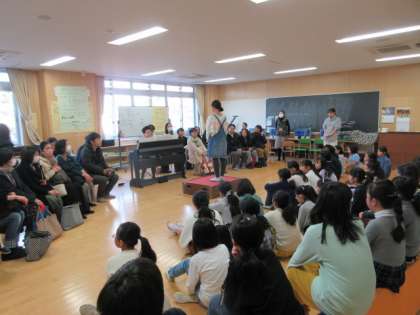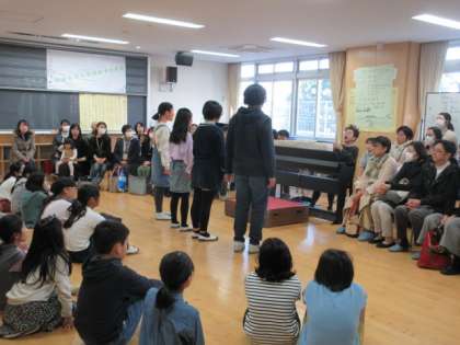 8日(土)の午後2時から、合唱団の練習がありました。練習の終わり10分間を「ミニコンサート」として4曲を披露しました。写真は上から、団長によるはじめの言葉、「山の朝」(輪唱)、6年生4人による「ふるさと」(重唱)の様子です。
