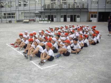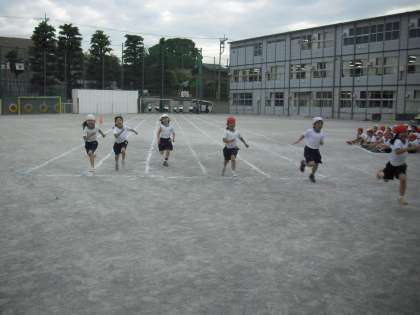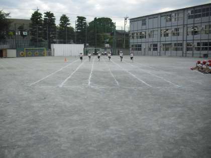 2年生の体育の授業の様子です。短距離走(直線走)を行っているところです。前を向いて真っ直ぐ走る指導をしています。隣の友達に気を取られてしまうと曲がってしまいます。走った後は、きちんと座って待つことができました。