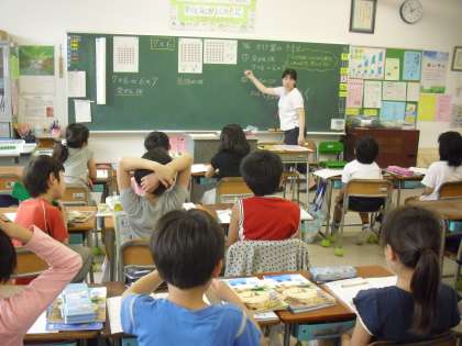 3年生の算数少人数指導の授業の様子です。かけ算のきまりを学習してるところです。昨年度は九九を一生懸命覚えた3年生。規則性を学び、かけ算のきまりについて理解します。学年を4グループに分けて授業をしています。