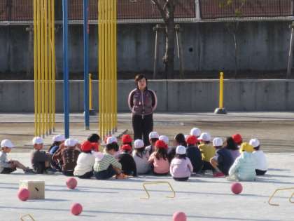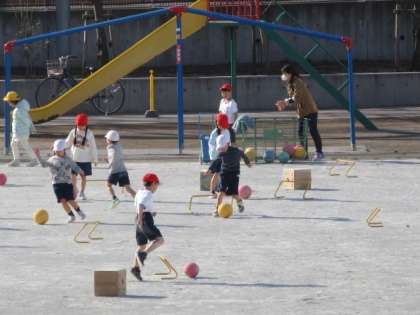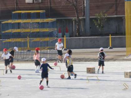 12日(水)の1時間目、1年2組は体育の時間でした。校庭で「ボールけりあそび」をしていました。一人でボールを蹴りながら、箱やミニハードルにぶつからないように動きました。
