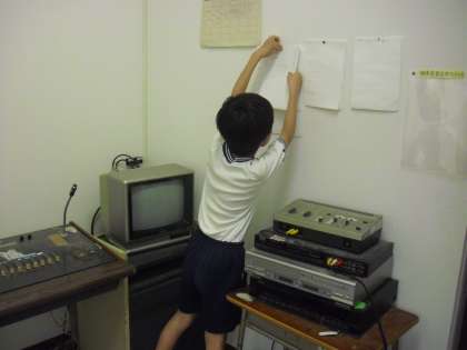 上から音楽集会で歌う歌の演奏のパートを決めている器楽委員会、運動会のスローガンの垂れ幕を作っている代表委員会、話し合った放送番組のプログラムを放送室に掲示している放送委員会です。