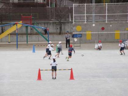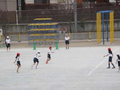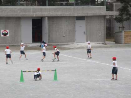 14日(金)の4時間目、3年2組は体育の時間でした。校庭で「ゴール型ゲーム」に取り組んでいました。3つコートを作り、2チームずつゲームを楽しんでいました。