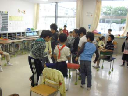 今朝の学級遊び「みんなでたのしく」の時間の様子です。雨のため、教室内での活動となりましたが、工夫した遊びやゲームを行い楽しく過ごしました。