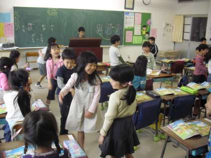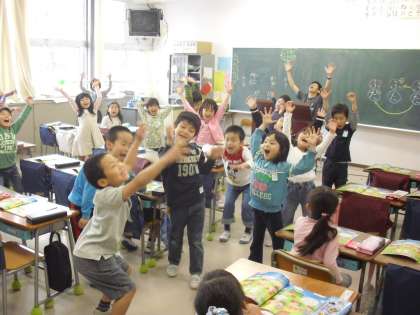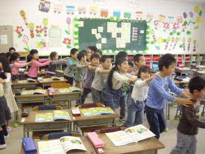 1年生の音楽の授業の様子です。歌を歌いながら動物の真似をしたり、じゃんけんをしたりと体を動かしながら楽しく歌っています。じゃんけん列車で友達全員がつながりました。