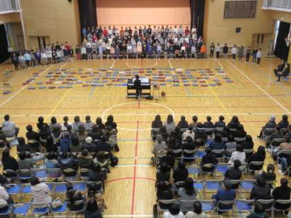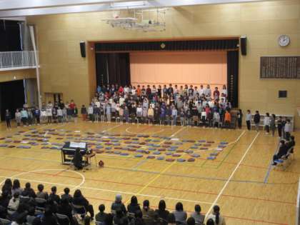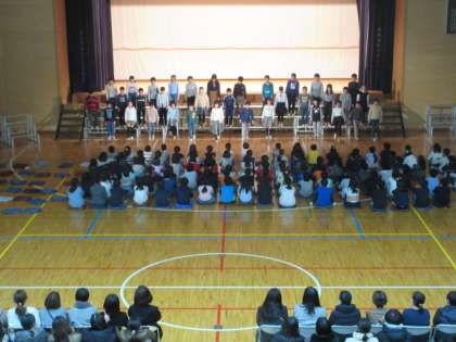 4年生による二分の一成人式では、十歳の決意を友達や保護者の皆様の前で披露しました。マイク無しでも後ろまでよく聞こえる声、そして背筋をピンと伸ばした立派な態度から子どもたちの思いが伝わってきました。決意を発表したあと、「COSMOS]の歌を歌いました。