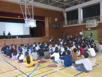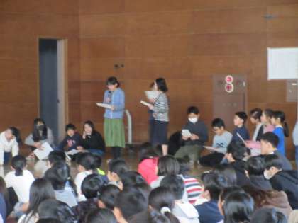 19日(水)の5時間目、5年生は中学校の体育館をお借りして「収穫祭」を行いました。米作りでお世話になった講師の方をお招きしました。まず、田越こしから稲刈り、籾すりまでのことを絵とお話で紹介しました。
