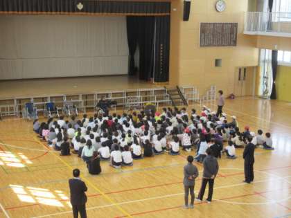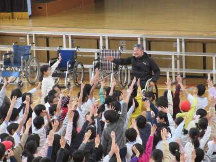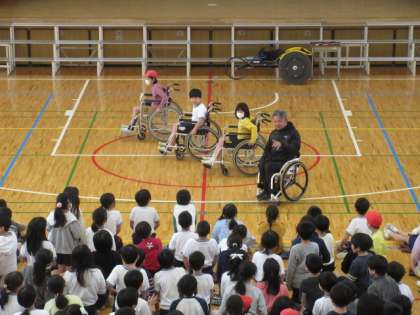 20日(木)の2時間目、4年生のみ体育館に残り、パラリンピアンの花岡さんのお話をさらに伺いました。後半は「車いすで遊ぼう」と題して、車いすに乗って競争をしました。子どもたちは車いすをより身近に感じたようです。