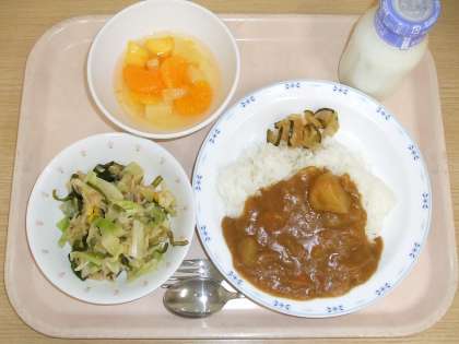今日は芦花小学校の給食で一番人気の「カレーライス」です。いろいろな種類の香辛料で作ったカレールウ、あめ色に炒めたたまねぎ、1つ1つの調理作業を丁寧に行い、おいしいカレーライスが出来上がりました。
