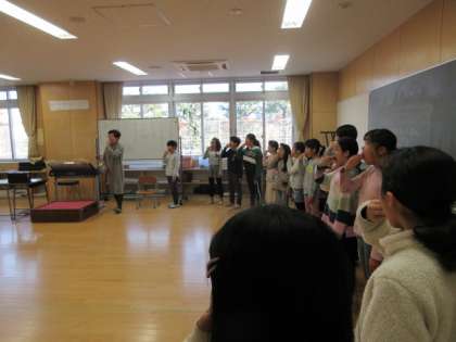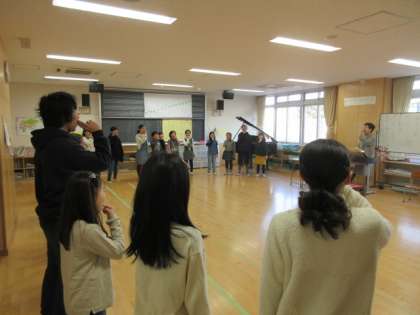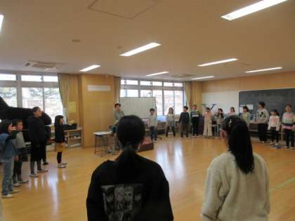 21日(金)の朝、合唱団の練習がありました。大きな輪を作り、「冬景色」の歌を歌いました。特に2番の歌詞を練習して、途中でリレー唱も行いました。