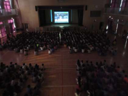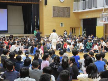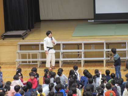 21日(金)の1時間目、1年生から4年生までとひかり学級の子どもたちが体育館に集合しました。オリンピック・パラリンピック教育の一環として、オリンピアンの方にお越しいただきました。今回は、女子柔道のメダリスト中村 美里選手です。最初に中村選手を紹介する映像を見ました。その後、子どもたちの質問に答えていただきました。