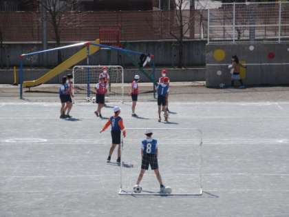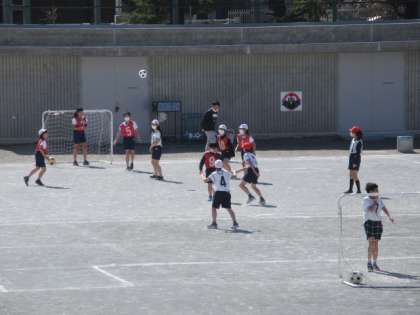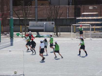 27日(木)の4時間目、6年2組は体育の時間でした。校庭でゴール型ゲームのサッカーに取り組んでいました。チームごとに準備運動や練習をしてから、ゲームをしました。声を掛け合ってゴールをねらう姿がすてきでした。