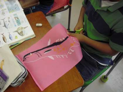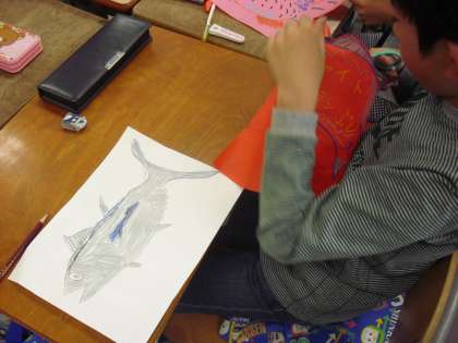 4年生の学級活動の授業の様子です。一人一人が思いをこめて魚を描いているところです。運動会の表現「ソーラン節」で使います。当日は、学年全員で描いた魚を大きな布を使って表現します。