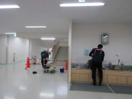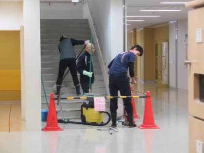 3月2日(月)、子どもたちの姿がない中、教職員は出勤して仕事をしております。主事室では、本日から校内のワックスがけを始めました。2日は1階から4階までの植物階段にワックスをかけました。3日以降も作業をしますが、表示をしておりますので、ご来校の際は、ご協力をお願いいたします。