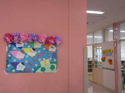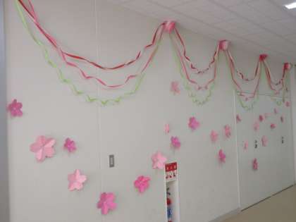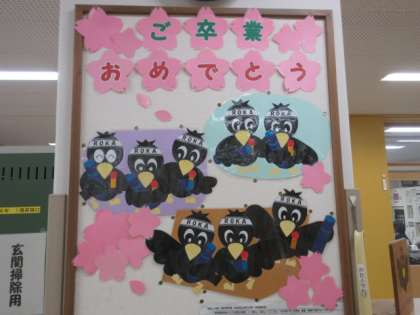 卒業を祝おうと体育館前や6年生の廊下に飾りを付けました。これも先生達で行いました。また、1階昇降口の芦花ラスは保護者の皆様により、卒業式バージョンになっています。