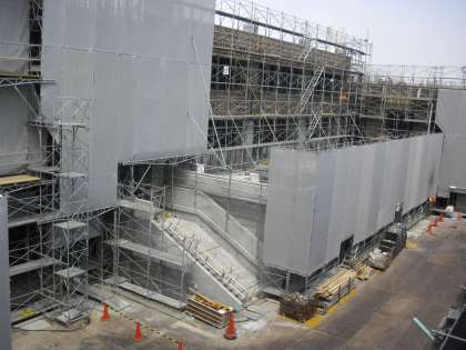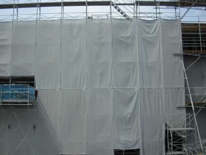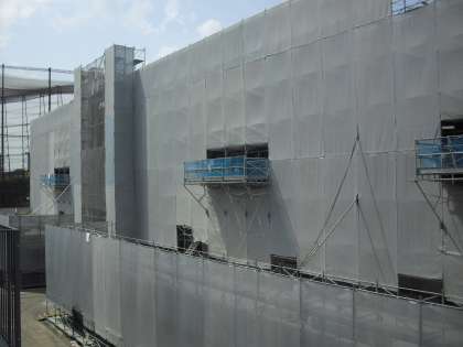 現在の新校舎建設工事の様子です。シートの裏では工事が着々と進んでいます。一部を除いてほぼ3階まではコンクリートになっています。4階部分で作業をしている人の姿も見られます。