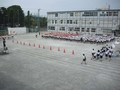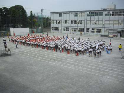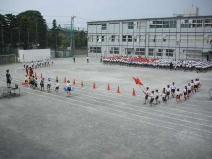 入場行進の様子です。中学校側の児童席から真っ直ぐに行進します。プラカードを持つ係児童を先頭に足並みをそろえて行進です。背筋をのばし、ひざを高く上げ、堂々と行進するように指導しています。