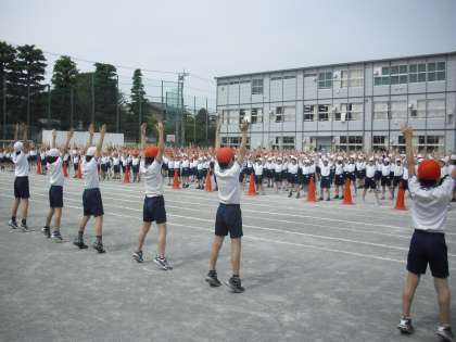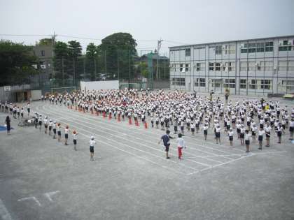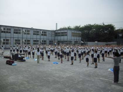 準備運動の様子です。体操の隊形に移動し、運動委員会の児童が前に出て見本を示しながら行います。手の先や腕がよくのびていて、先週の体育朝会で行った成果が表れていました。