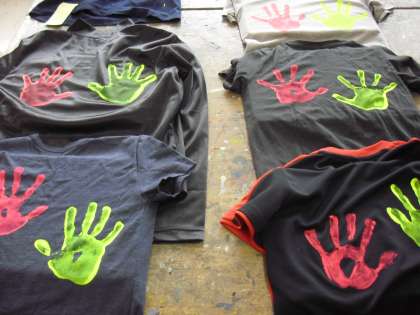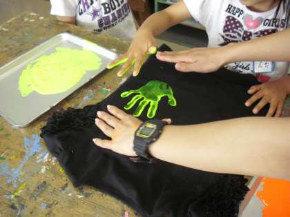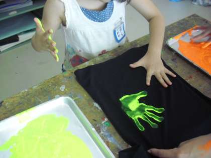 1年生が、運動会の表現の衣装に手形を付けている様子です。ここは図工室。てのひらにけい光色の絵の具をつけて、演技の際に着るTシャツに自分の手形を付けます。絵の具の感触が楽しかったようです。