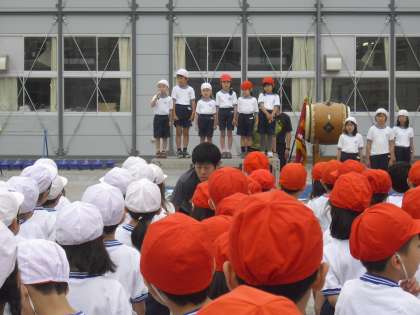続いて、代表委員会からスローガンの発表、1年生の児童代表のことば、器楽委員会の演奏に合わせて校歌を歌いました。代表で話すことも練習ですが、しっかりと話を聞き、待つことも練習です。