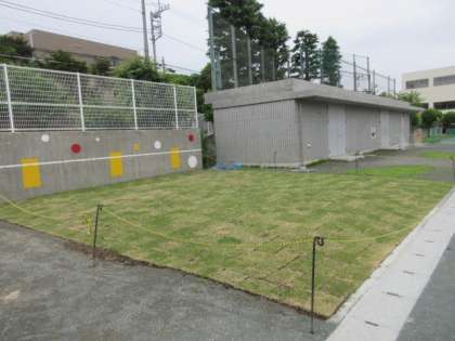 南門を入ってすぐのスロープの校庭側に、コンクリートの投てき板があるのをご存じでしょうか? その前あたりの一角を仕切りまして、芝生の養生を始めました。現校舎が建った際、その場所にも芝生があったそうで、長い年月の間に消えてしまったと聞いています。このような状況のときにどうかとは思いましたが、今だからこそ養生もしやすいということでの取組です。柵の外からですが、ちょっと覗いてみてください。
