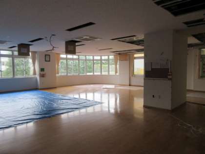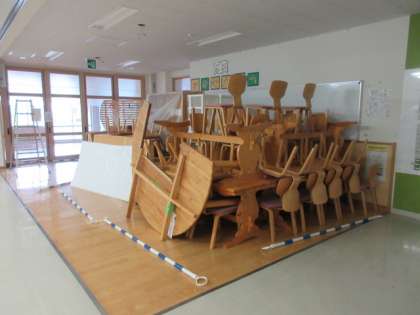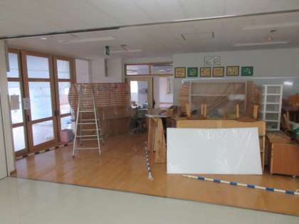 北側校舎増設工事にあわせて、校内の一部にも工事が入ることは、すでにお伝えしてあるかと存じます。そのうち、図書室の位置を旧パソコンルームと入れ替える作業が、本日より始まりました。動物階段を2階まで上がり切ったところのスペースが、明日には仮囲いで覆われてしまいます。ちょうど写真のテーブルや椅子等が組み上がっているところです。ちなみに、図書室内は、もう何もなくなってしまいました。