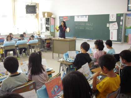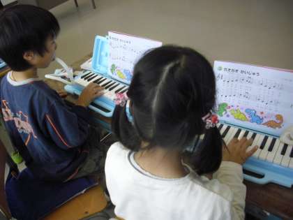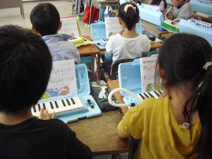 2年生の音楽の授業の様子です。鍵盤ハーモニカの練習をしているところです。正しい指使いができているか、近くの席の友達と見合いながら学習しています。2年生も譜面を見ながら演奏しています。