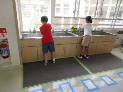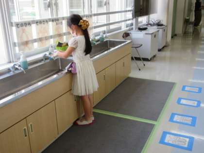 分散登校中ですから、流し場が密になることはありませんが、子供たちはみな、意識しながら丁寧な手洗いを心掛けています。洗い終わった後、両手を振って、水しぶきを飛ばすような姿は、一切見ることはありませんでした。
