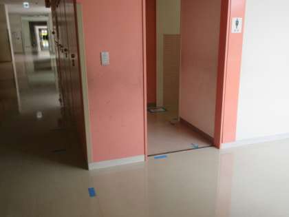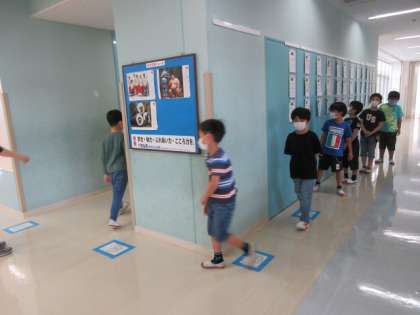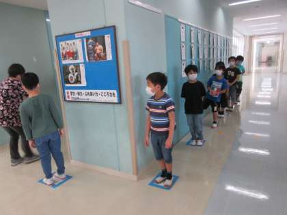 トイレ前の流しも、混むことはありません。ですので、3年生の某クラスが、列を作る練習をしていた様子を掲載いたします。ソーシャルディスタンスを守り、順番に手洗いに向かいます。通常登校が始まっても、このように焦らず並ぶことができるといいですね。ちなみにトイレの入口は、一番下の写真のように足元がマークされています。