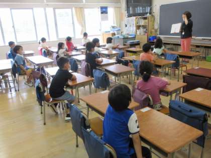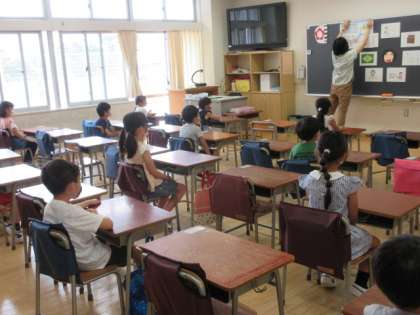 4組は、新型コロナウイルス感染症についての紙芝居を見ているところでした。5組は、担任の自己紹介コーナーでした。出身地や、今までにしてきた仕事のことなどをクイズのようにして伝えていました。