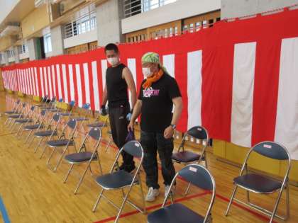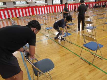 下の3つの写真は、1年生の子供たちの座席や保護者の皆様が座る席は一人一人の間隔を十分に空け、一つ一つの椅子を丁寧に消毒して拭く先生、出身保育園や幼稚園からの祝電を貼る先生、紅白幕を張り、床の掃除や教職員が立つ位置間隔を確かめる学校主事さんの様子です。