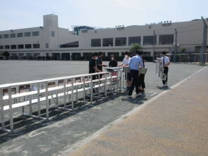 次の3枚の写真です。集合写真の準備をする先生、そして準備が整った会場の様子です。