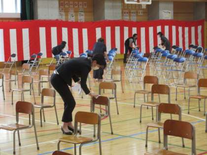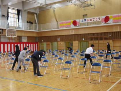 私は司会でしたので、式中の写真はありません。ご了承ください。式が終わると、次の回に参列する子供たちや保護者の方々に、安全に座っていただくよう消毒作業を行いました。一席一席、丁寧に拭かせていただきました。教職員は大きく3グループに分かれてローテーションをしながら、受付、記念写真撮影補助、会場整備等を担当するなど、いろいろな役をこなしていました。