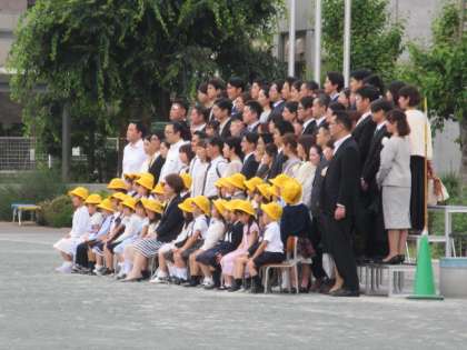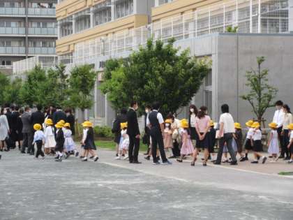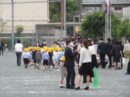 校庭での記念撮影の様子を、体育館のドアを開けて、横から眺めました。ぞろぞろと引率されていく1年生。定位置に着いたら、マスクを外して「はいチーズ!」。例年は、体育館内で撮影をしてまいりましたので、校庭でのショットはレアかもしれません。すると、その前を、次の回の1年生のご家族が通られました。