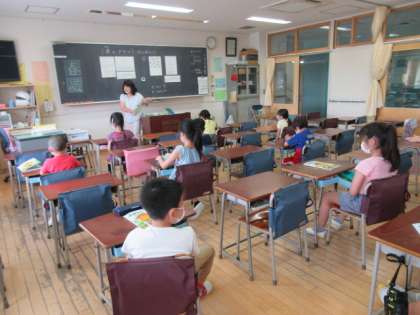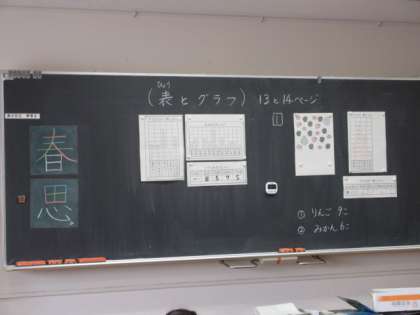 2年4・5組の教室の様子です。3時間目の4組と5組は算数の表とグラフの学習でした。くだものの数を種類ごとに表に書き入れることができていました。3枚目は算数「表とグラフ」の板書です。