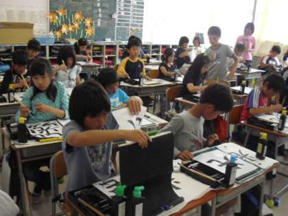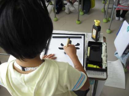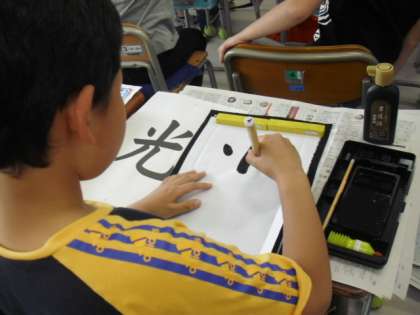 4年生の国語の書写の授業の様子です。漢字一文字で「光」を手本に取り組んでいるところです。とめ・はね・はらい、左右のバランス等に気を付けながら、筆を進めます。よい姿勢で書くと気持ちも引き締まります。