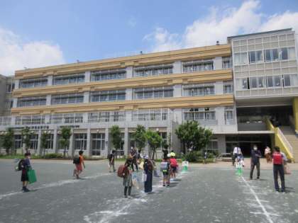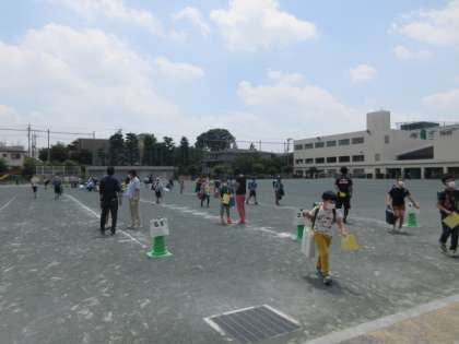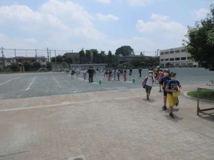 気温がどんどん上昇し、空には夏の雲が浮かんでいます。午後の登校の様子を今日はお伝えします。校庭にコーンを置き、ラインを引いて、学年ごとに列をつくりました。子供たちの体温と健康状態の確認をしてから入室してもらいました。