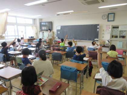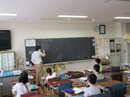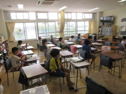 続いて3年3組と4組の分散登校の教室での様子を紹介します。3組は、算数の「たし算とひき算」の学習です。担任の先生が筆算のしかたのポイントをみんなに質問すると、元気よく手を挙げて答えています。4組は、登校して間もなく提出物を確認しています。先生が一つ一つを大切に預かりながらすすめていました。