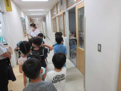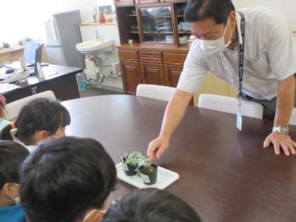 今日の1年生は、学校探検をしました。担任の先生を先頭に、上手に2列に並んで教室を出発!主事室・事務室・体育館・保健室・職員室などを回って校長室へ。校長先生から机の上に置いてある植物を紹介していただくと、興味津々にのぞきこみ…。1年生のみなさんちょっとソーシャルディスタンスが気になりますが…。学ぶ意欲の高さは、1年生の子供たちみんな花丸です!
