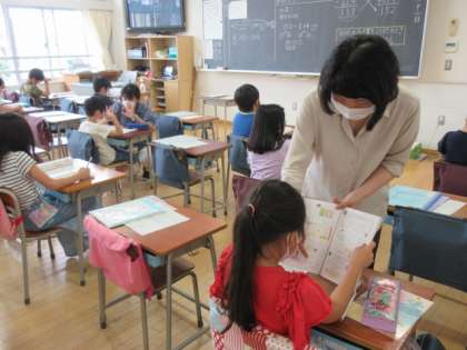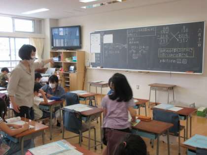 2組は、算数でした。教室に入ると、各自が練習問題に取り組んでいます。質問のある児童は2人の先生へ。本来、習熟度別授業をする際の講師と、チームティーチング形式の授業です。3けた同士の引き算は、2けたのときのそれと同じ。当然筆算をした方がわかりやすいことになります。文章問題は、線分図に表して、確実な理解に結び付けていました。