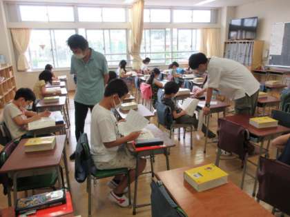 4組は、国語辞典をどう使うかについてのレクチャーの時間でした。基本的ないくつかの引き方をもとに、各自が実際に、繰り返し引いてみる場面のようです。