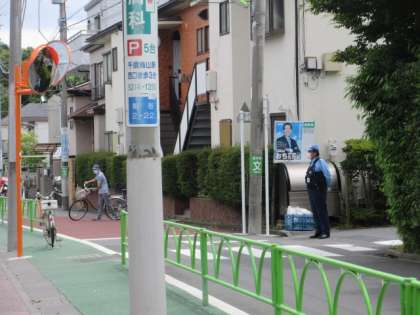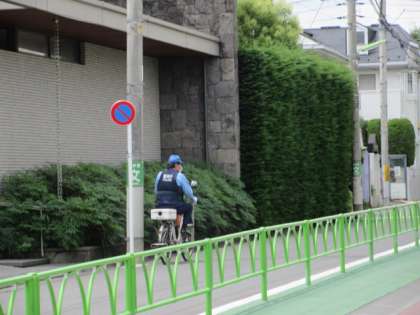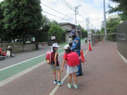 芦花小学校の南門そばの横断歩道で1台の自転車が止まっていました。歩み寄ってみると、成城警察署の方でした。お声をかけると、子供たちの登下校の見守りをしてくださっているとのこと。心強いですね。