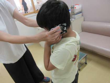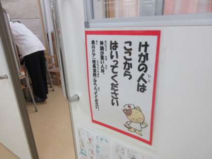 大きなスペースのある従来の保健室は、学校内で発熱した場合などを想定し、主に体調がすぐれない時に利用します。一方で、下の写真のように、けがなどの外傷で処置をしてほしい時には、保健室前に新しくできた小さなスペースを利用してください。いずれの場合にも養護教諭がお子様の体調やけがの状況を見取り、丁寧に対応いたします。