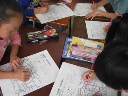 今日は、班ごとに地域を決めた後、どの道を通って調べるか話し合いをしました。
