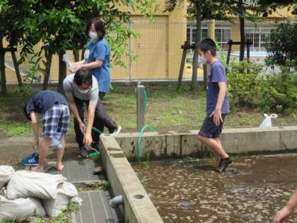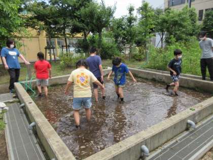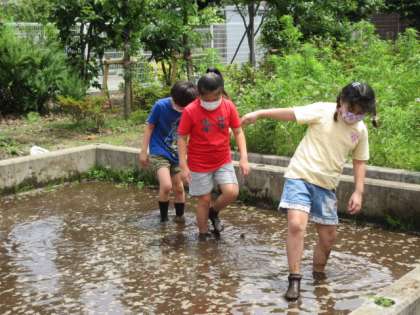 こういう暑い日は、水が恋しくなりますね。そういえば、田んぼに水が入ったことを聞いていたので向かってみました。すると、賑やかな声が聞こえてきました。「あっ、いいなぁ、水遊び?」と子供たちに問いかけると、「遊んでいるんじゃないよ。お米のためなんだよ。」とのこと。失礼しました。代かき作業だったのですね。