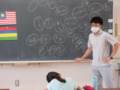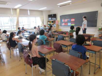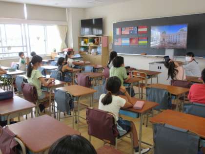 ちょうど3・4組で、同時間帯に同内容を扱っていました。4年生では、参加国のいくつかに焦点を当て、その国について様々に調べてみようという課題に取り組みます。今日はそのガイダンス的な授業の日でした。各国に関わる映像を見たり、思い付く食べ物や、衣装などの言葉を出し合いながら広げていく「イメージマップ」作りをしたりと、わくわくするスタートが切れました。