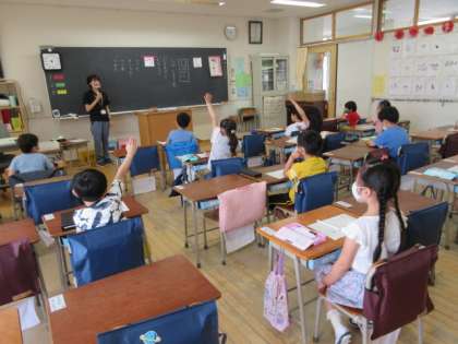 1年2組の子供たちは、教室で「ひらがな」の練習をしました。今日の字は「し」と「つ」です。みなさん、なぜこの字から1年生は学習すると思いますか?答えは、1画で(一筆で)書けるひらがなだからです。「し」や「つ」書き方を先生から教わった後はことば集め。「つ」を使ったことばを知っている人はいますか?という問いかけに、みんな「ハイ!!」と手をあげて答えていました。